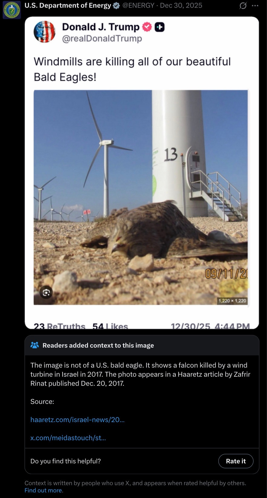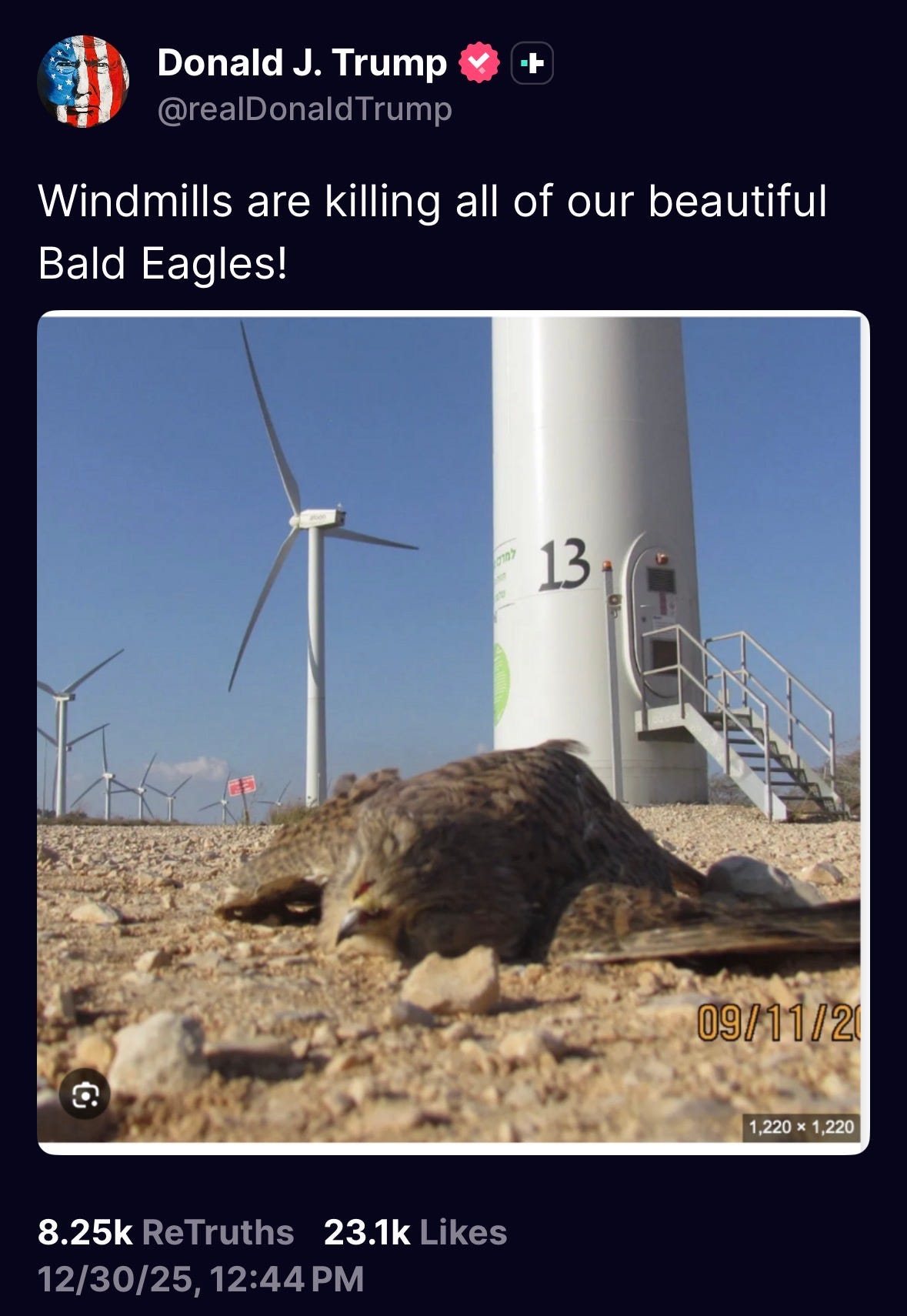 → Trump posts a dead falcon by a windmill