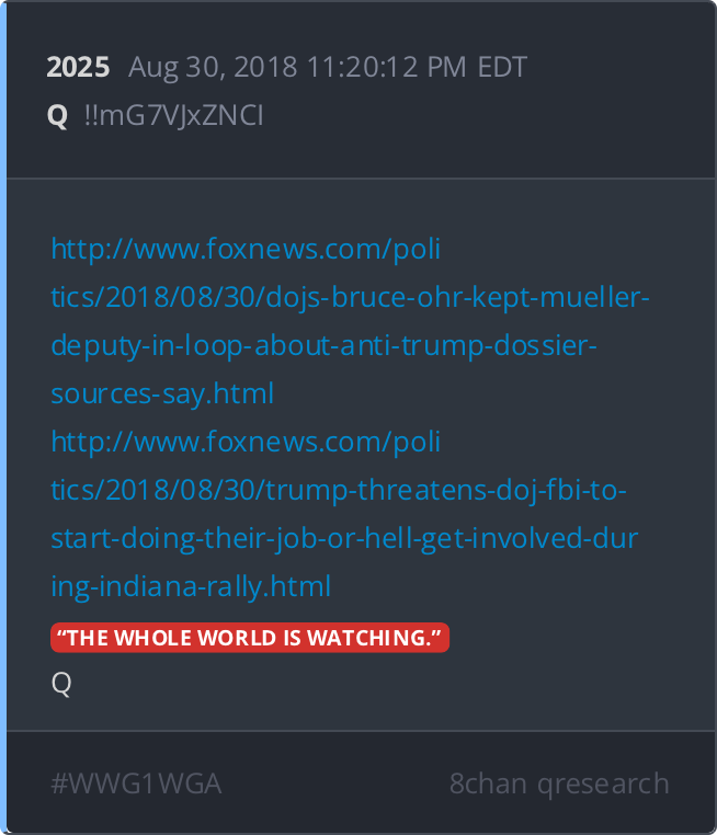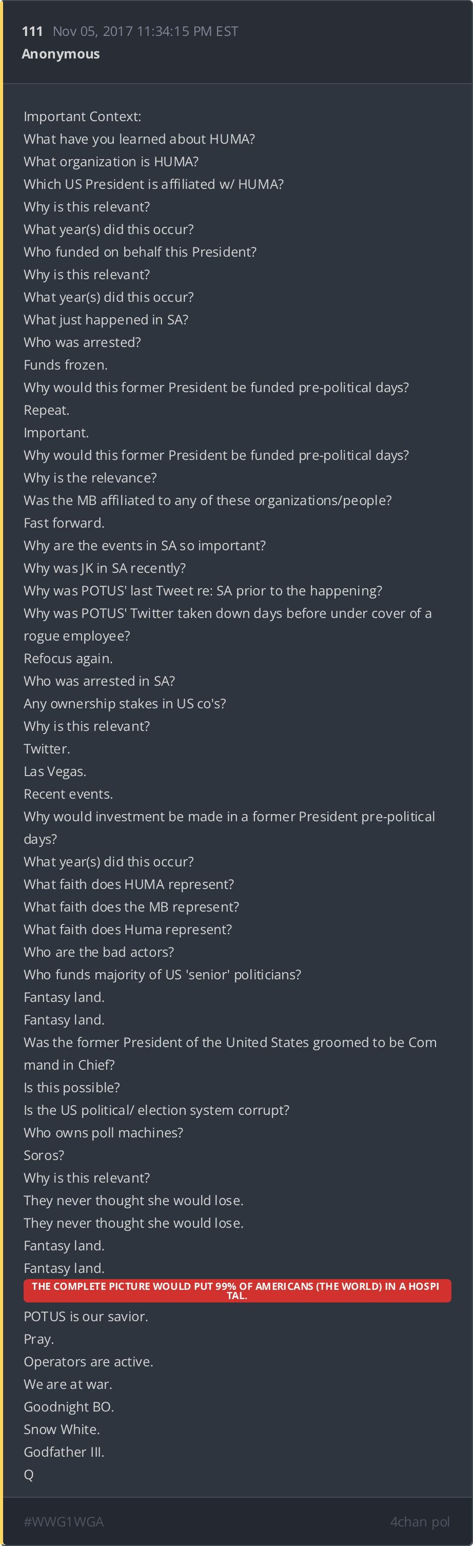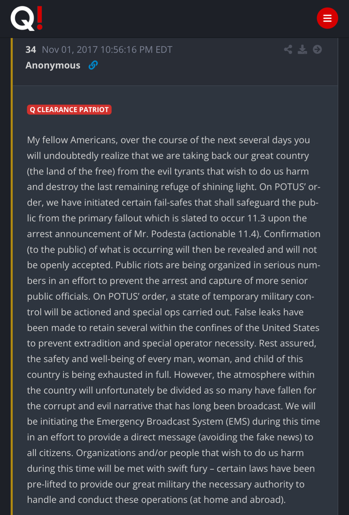 Mentions “Q Clearance Patriot” and Podesta arrest