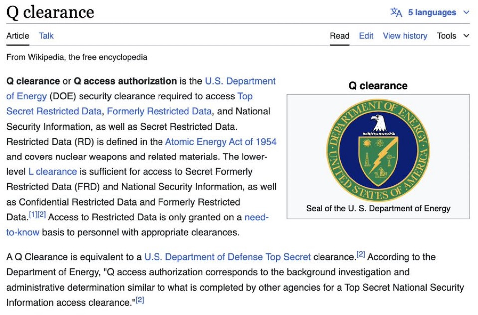 “Q Clearance” = access to Top Secret nuclear data
